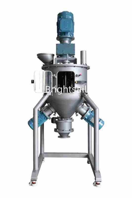 This vertical blending unit combines a cone-shaped vessel with a ribbon agitator, offering both efficient powder mixing and gentle material handling